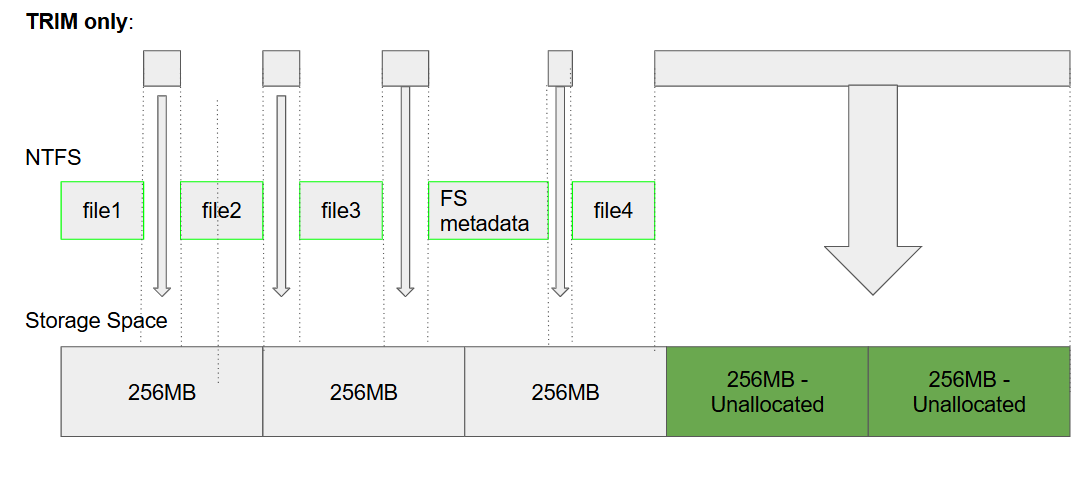Figure 6. TRIM deallocates contiguous 256MB slabs in Storage Space. But it cannot deallocate smaller free space areas as they don’t fit into slab division.